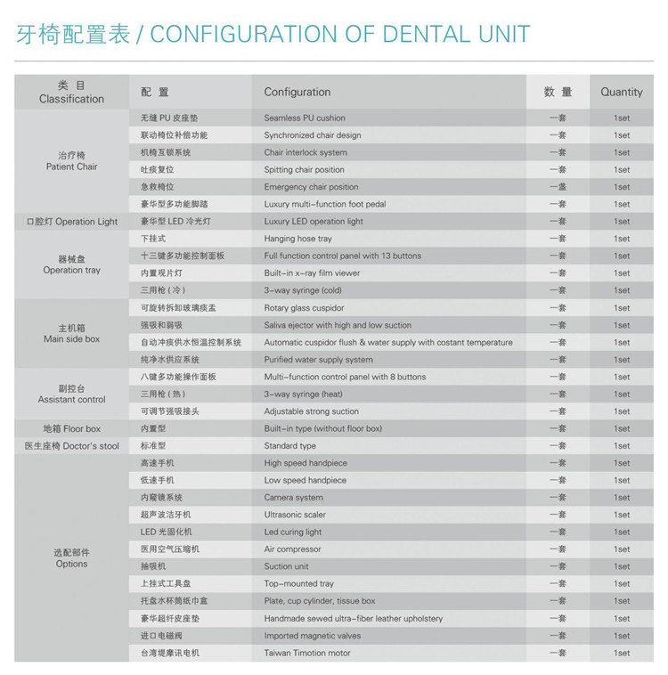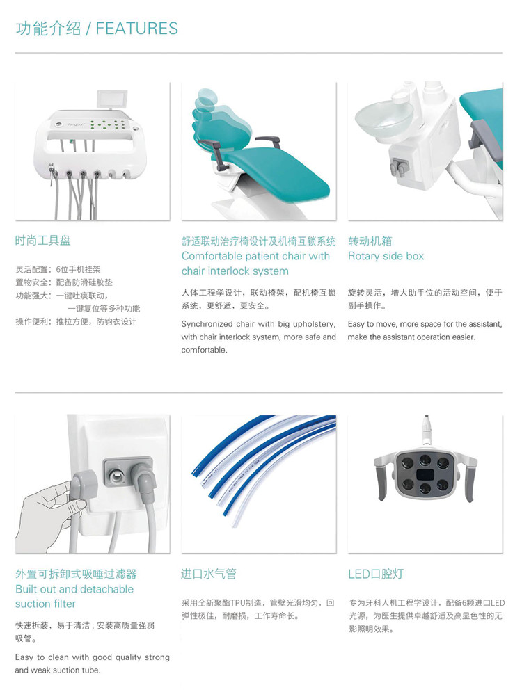3. New design hanging delivery tray, detachable & easy clean handpiece holder block, ergonomic easy to move tray handle.