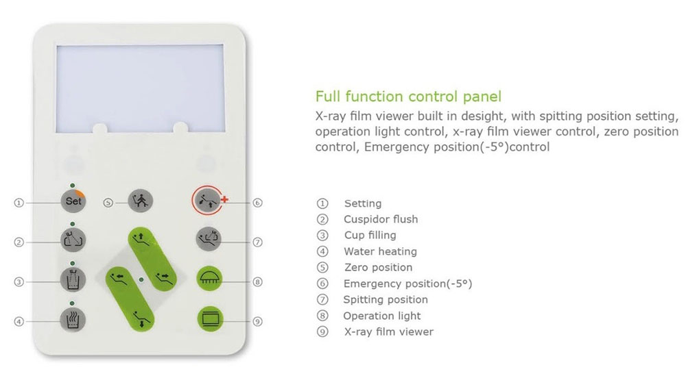 4. Full function control panel, with X-ray film viewer built in design, spitting position setting, operation lamp control, zero position, emergency position (-5°) control.