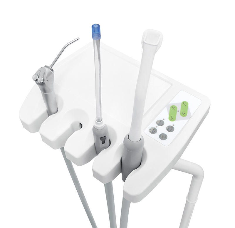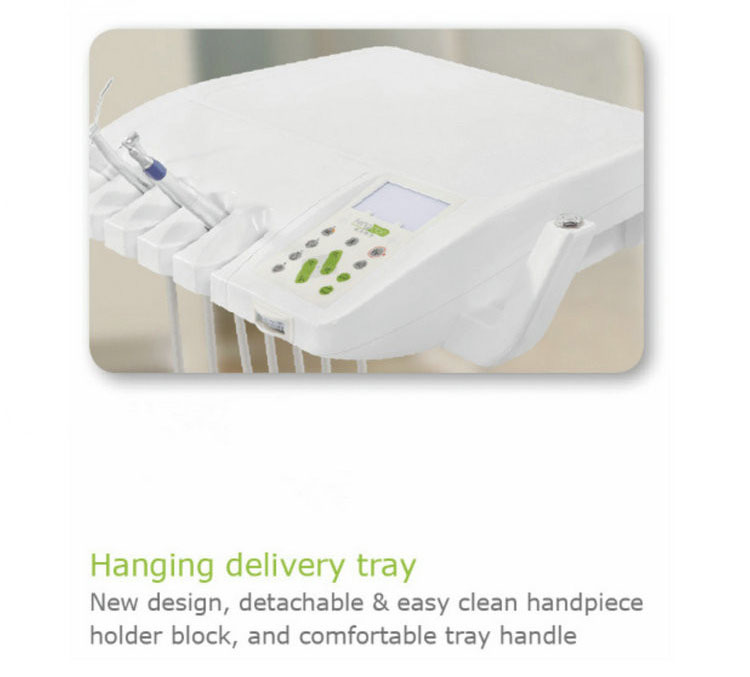 3. New design hanging delivery tray, detachable & easy clean handpiece holder block, ergonomic easy to move tray handle.