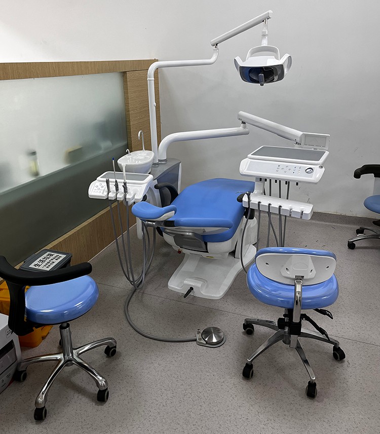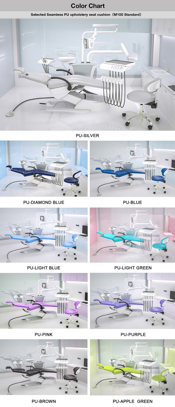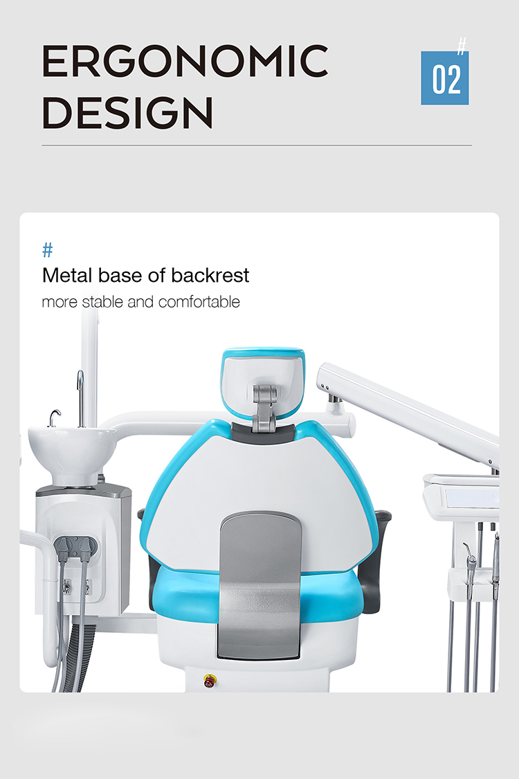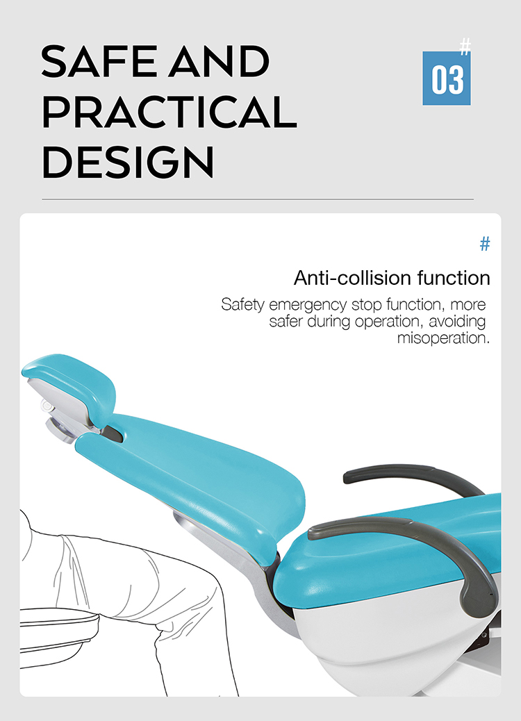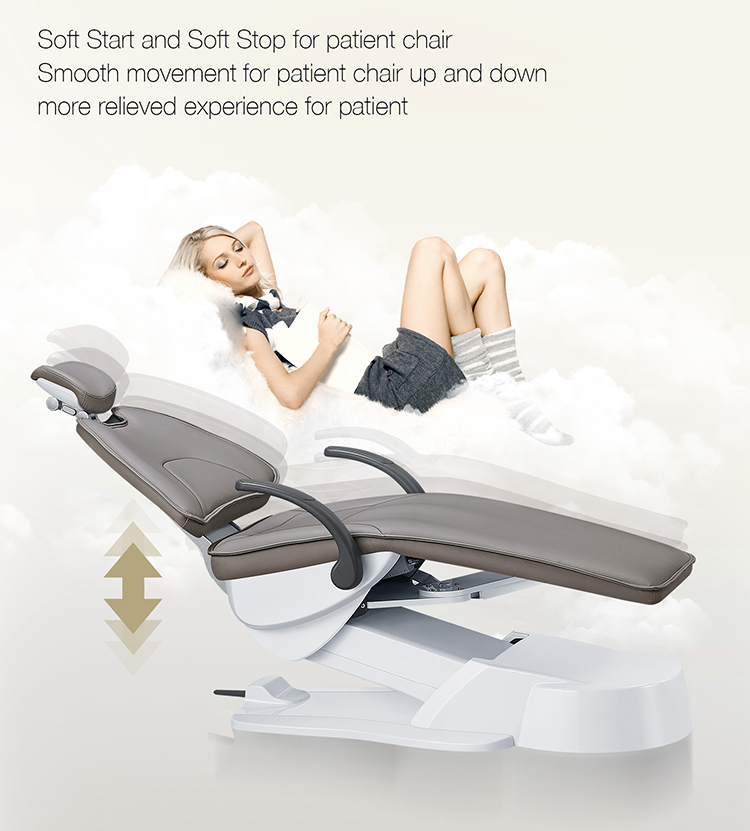 1. Seamless PU cushion, soft start and soft stop function, synchronized chair design, chair interlock system, spitting chair position, treatment chair position, emergency chair position, backrest anti-collision, Ti-motion motor.