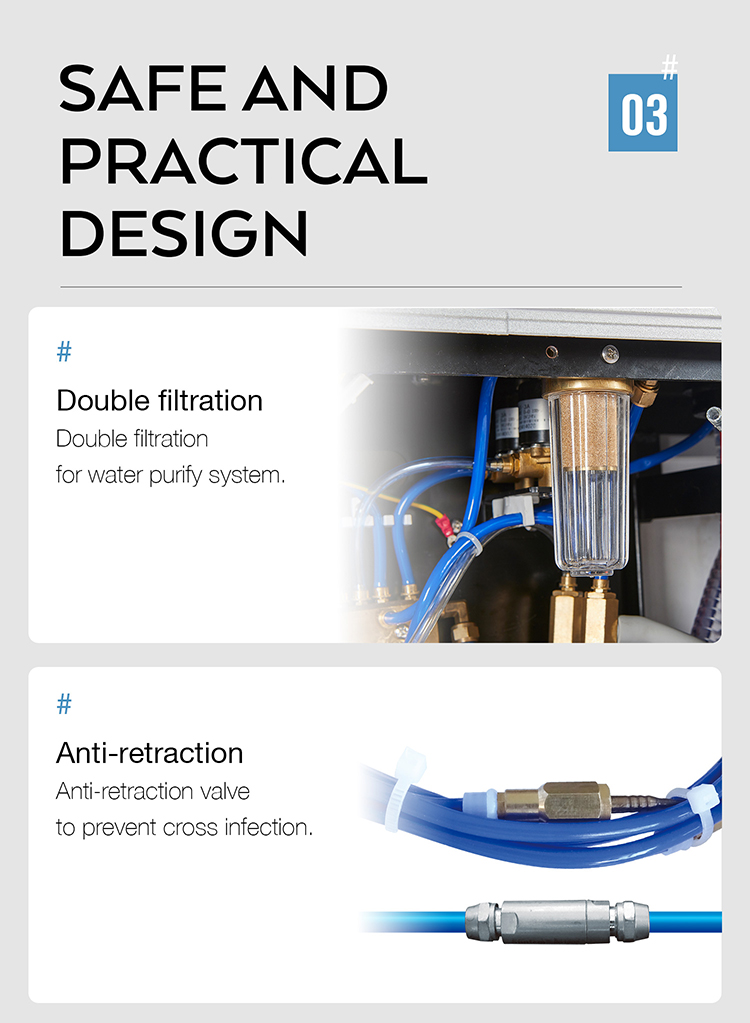 3. Rotary side box, rotatable ceramic cuspidor, imported water & air tube, independent water filter, dual filtration function.