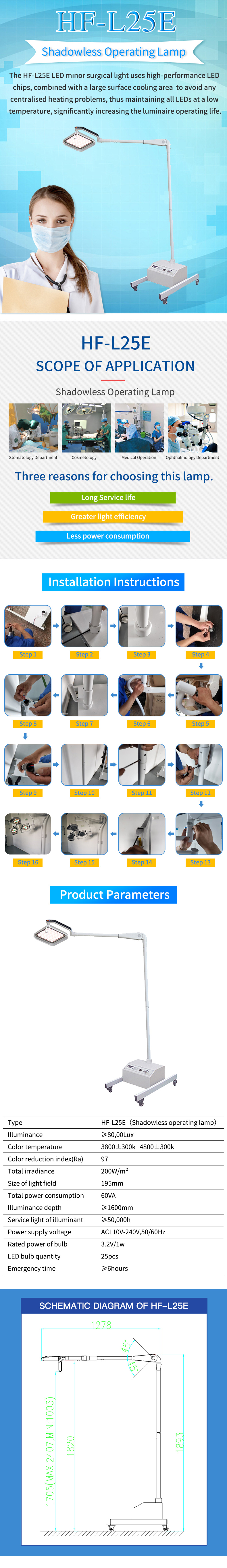 The HF-L25E LED minor surgical light uses high-performance LED chips, combined with a large surface cooling area to avoid any centralised heating problems, thus maintaining all LEDS at a low temperature, significantly increasing the luminaire operating life.